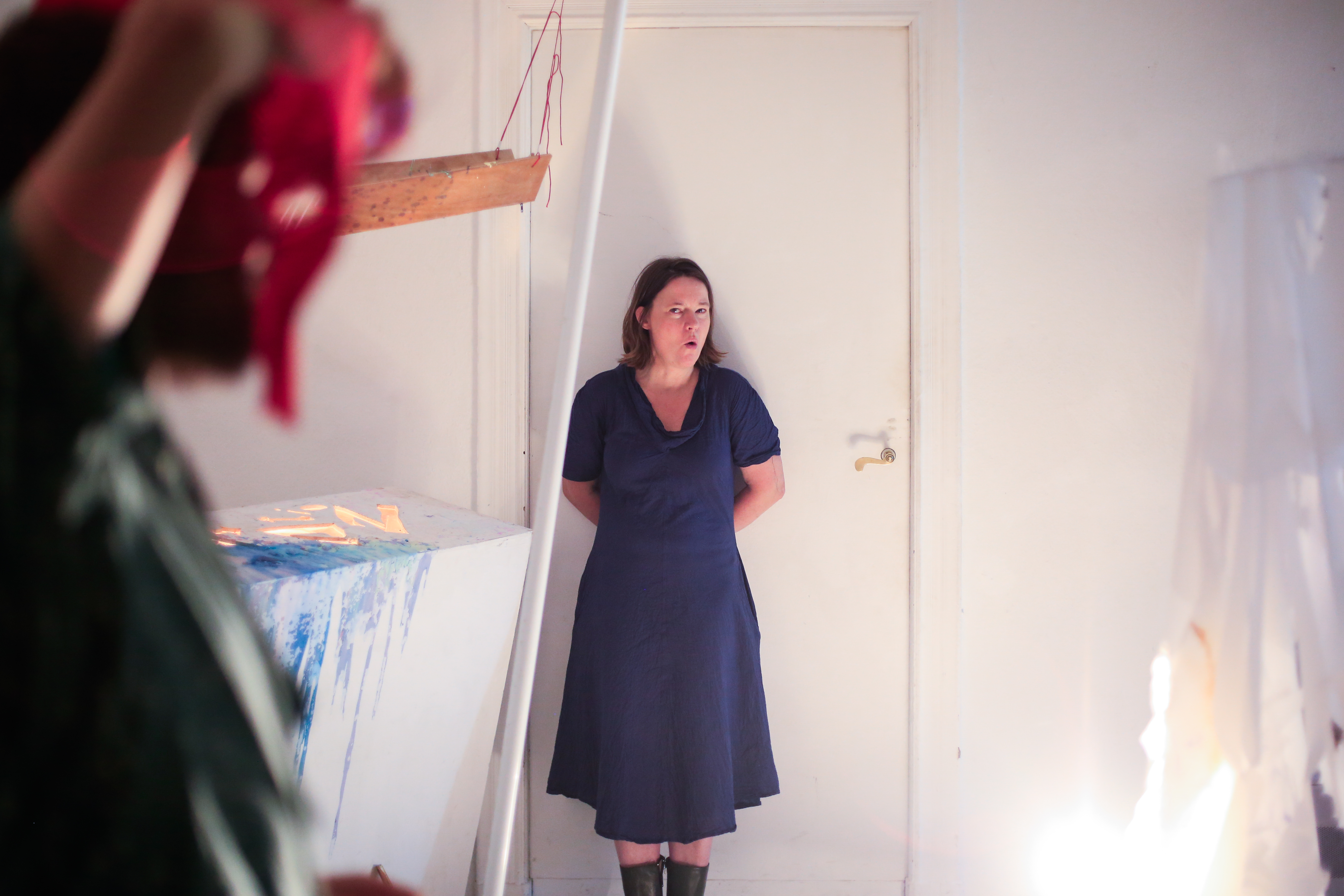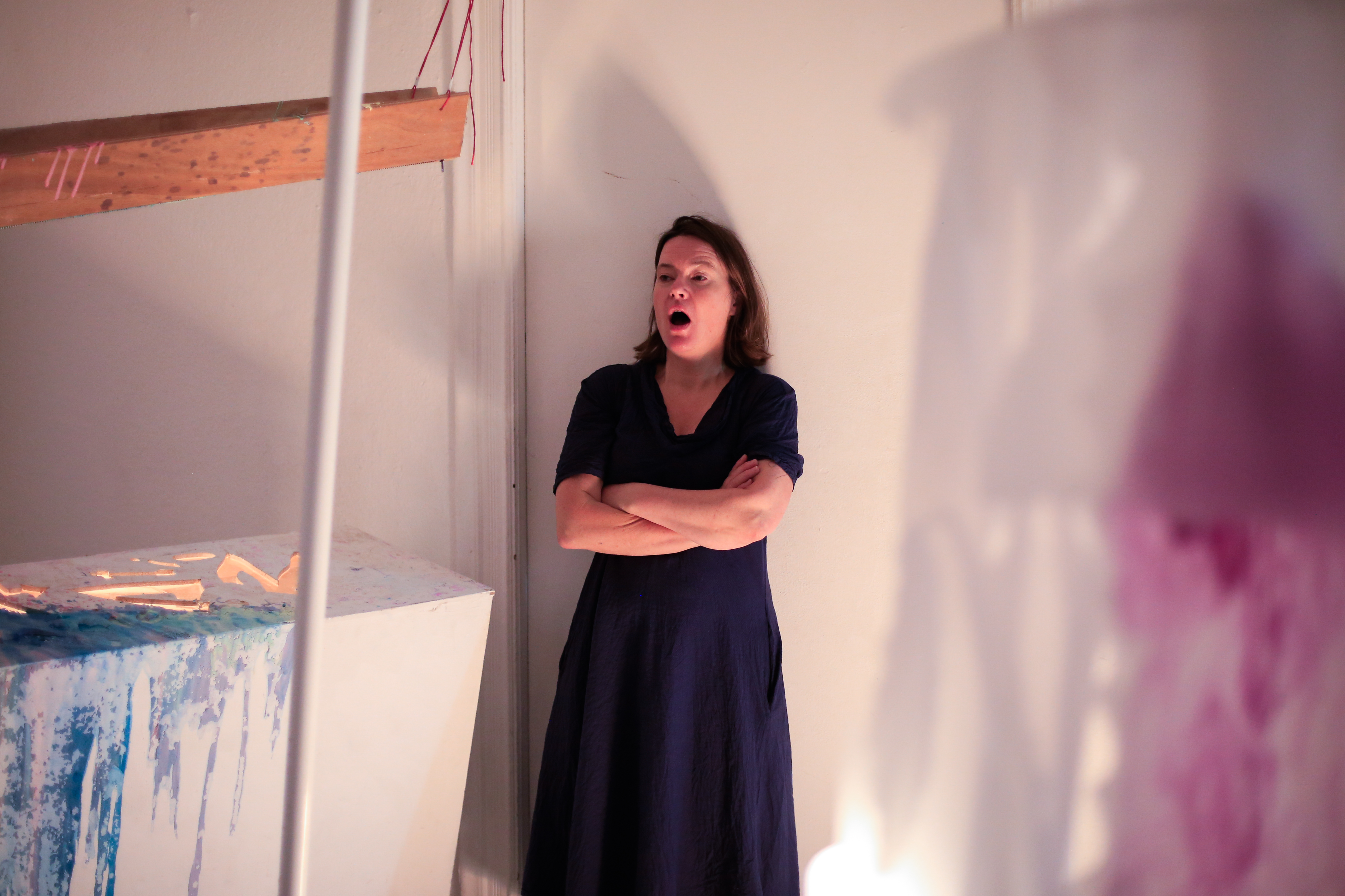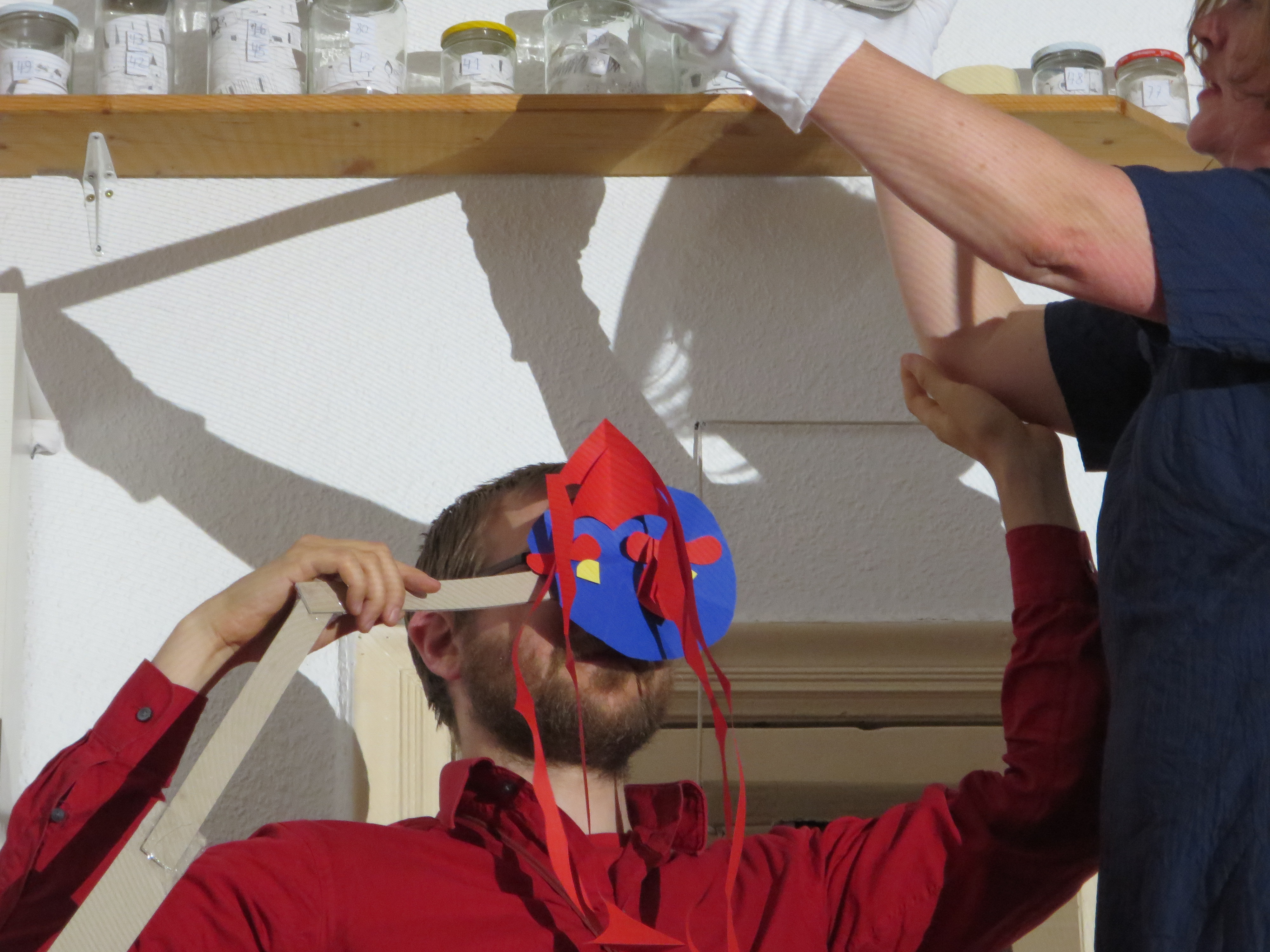 Performance for projecting voice (Theda Weber-Lucks), light+shadow-projection / object guidance (Kathrin Köster) and mute, reactive body (D.K.).